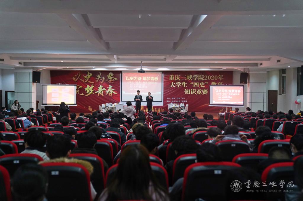 12月3日,由学生工作部(处)主办、电子与信息工程学院承办的“以史为鉴,筑梦青春”大学生“四史”教育知识竞赛在明辨楼2-104学术报告厅举行。学生处副处长罗雪,电子与信息工程学院党总支常务副书记王乾丰、副院长王安蓉、党总支副书记牟奇建担任评委,辅导员和学生代表300余人观摩比赛。