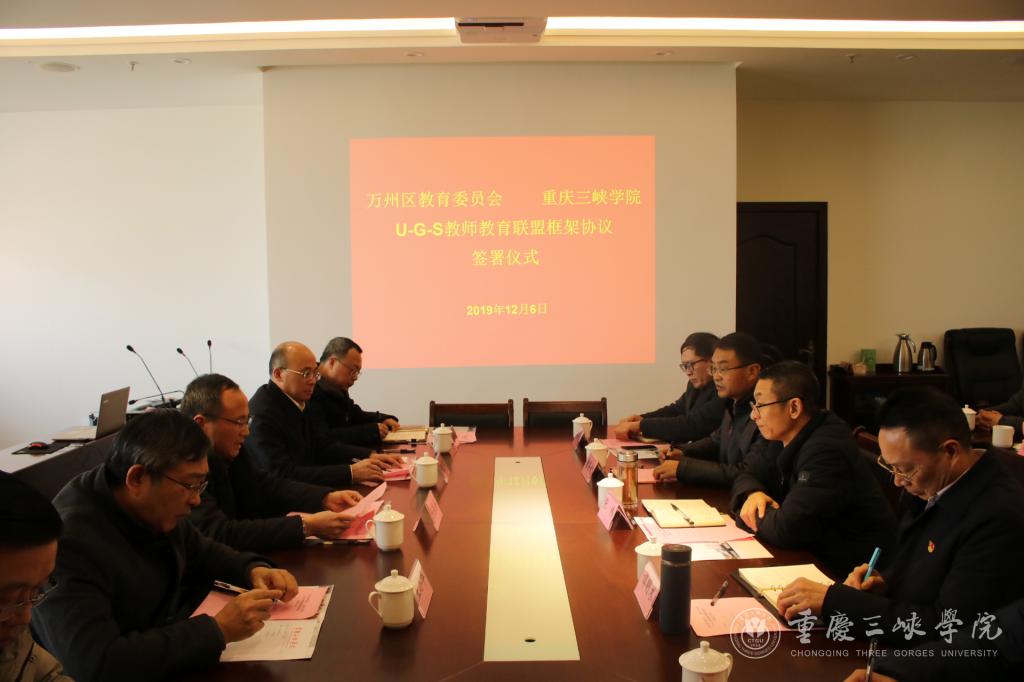 12月6日下午,KY开元集团官网与万州区教委共建U-G-S教师教育联盟签约仪式在开元官网科技楼819会议室举行。万州人大常委会副主任陈保余、万州区教委主任程宏江,KY开元集团官网校长张伟、副校长谭明术、万州区教委相关科室负责人和KY开元集团官网相关职能部门负责人、师范专业二级学院院长出席了本次签约仪式。