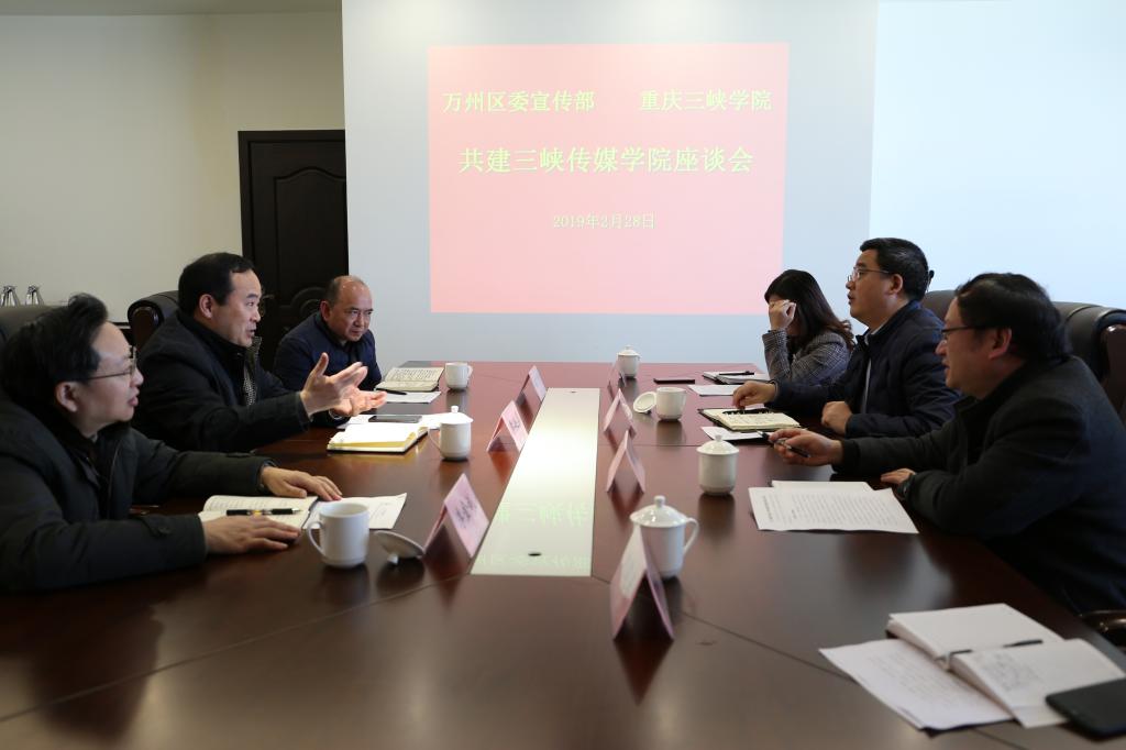 2月28日, 学校举行共建三峡传媒学院座谈会,万州区委常委、宣传部长刘丹文,学校党委书记李廷勇、党委副书记崔广平、纪委书记李金斌;宣传部、办公室及传媒学院负责人出席会议。