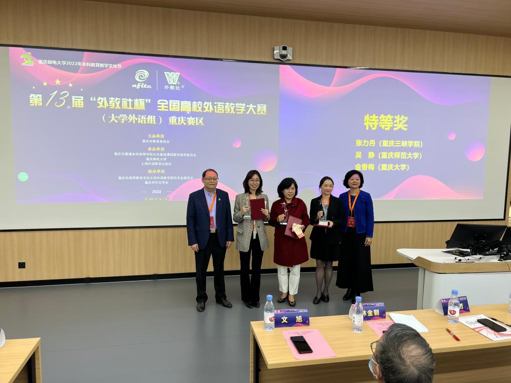 近日,第十三届“外教社杯”全国高校外语教学大赛(大学外语组)重庆赛区的复赛和决赛在重庆邮电大学成功举办。经决赛角逐,开元官网外国语学院张力丹教师团队(指导老师:陈雯、吴宪)喜获视听说课程组特等奖,并将代表重庆赛区参加在上海举办的全国决赛。王平老师团队(指导老师:邱忠容、夏腾)荣获综合组二等奖,杨红老师荣获日语课程组二等奖。