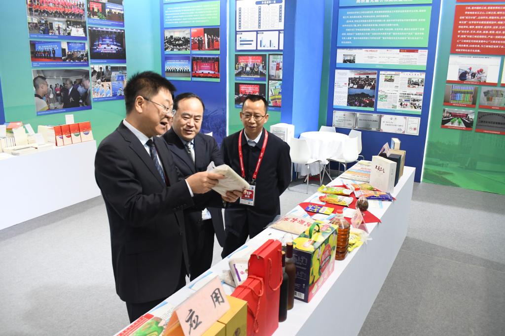 正在这时,又有十几名专家在重庆市高等教育学会刘颖教授的引导下走了进来,他们有的看展板,有的饶有兴趣地翻阅“三峡文化”系列成果书籍,还有的欣喜地“品味”着摆在展桌上的大米、玉米、面条等实物成果,看样子,真的有点流连忘返了。