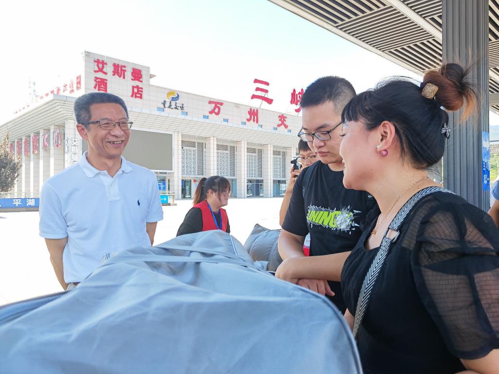 校长张伟在万州北站迎新点与家长、新生热情交流