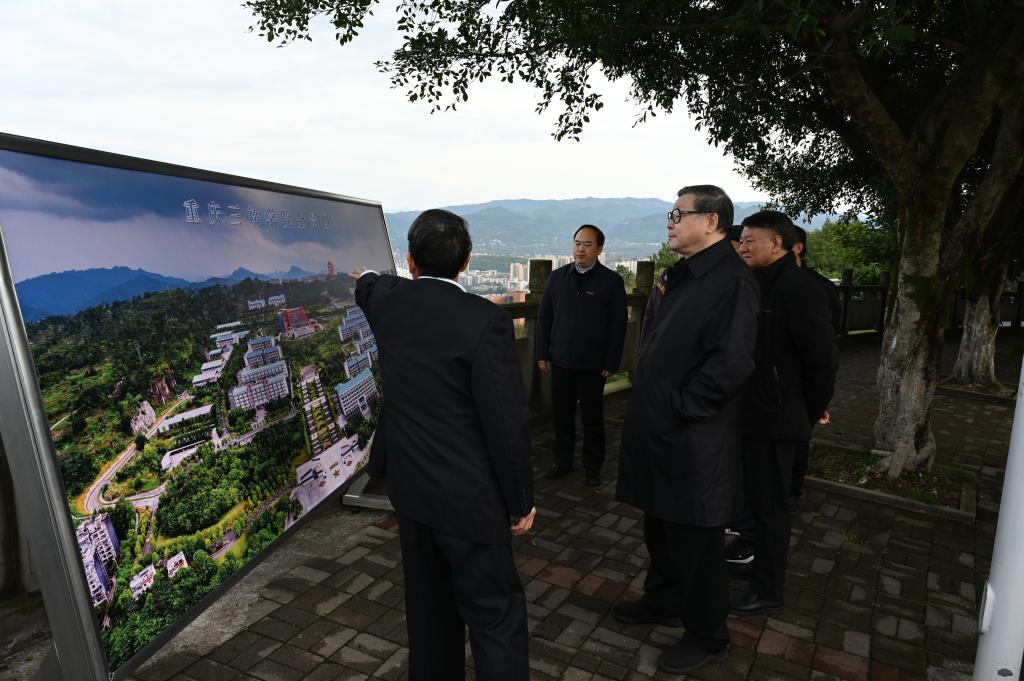 依山而上,来到具有万州“城市之巅”的校园后山顶,向下俯瞰,整个校园尽收眼底,一片金辉;极目远眺,175蓄水后的滨湖波光粼粼。年近7旬的白庚胜非常高兴地说:“太棒了,这里仿佛有一股龙虎之气!”随后,他轻声地吟诵起伟人的诗句:“虎踞龙盘今胜昔,天翻地覆慨而慷!”