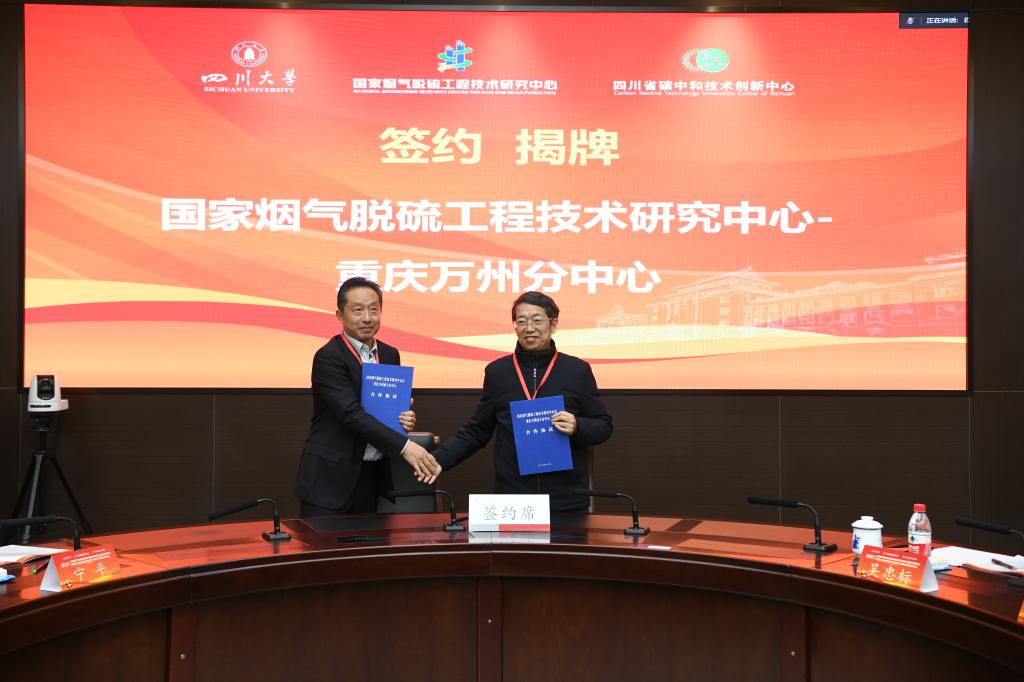 王建平与刘超为“国家烟气脱硫工程技术研究中心重庆万州分中心”揭牌,祁俊生与李建军签署合作协议,汪华林院士为分中心负责人颁发聘书。双方对分中心未来在技术研究、人才培养、资源共享等方面的建设规划进行了积极探讨。