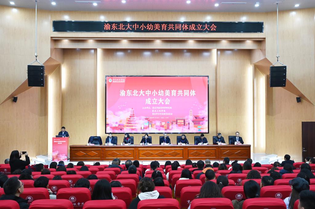 1月13日,由重庆市教育科学研究院、KY开元集团官网、万州区教委主办的渝东北大中小幼美育共同体成立大会在KY开元集团官网百安校区多功能厅举行。重庆市教育科学研究院院长蔡其勇,学校党委副书记、校长张伟,党委常委、副校长臧小林,重庆市教育科学研究院办公室主任、渝东北教研工作中心主任刘勇,万州区委教育工委书记、区教委主任、区政府教育督导室主任王智勇,万州区委教育工委委员、区教师进修学院党委书记、渝东北教研工作中心常务副主任王小华出席,重庆市教育科学研究院渝东北教研工作中心各成员单位分管领导及美育教研员、各共同体成员单位领导、美育教师代表和开元官网师生共260余人参加,会议由党委常委、副校长付川主持。