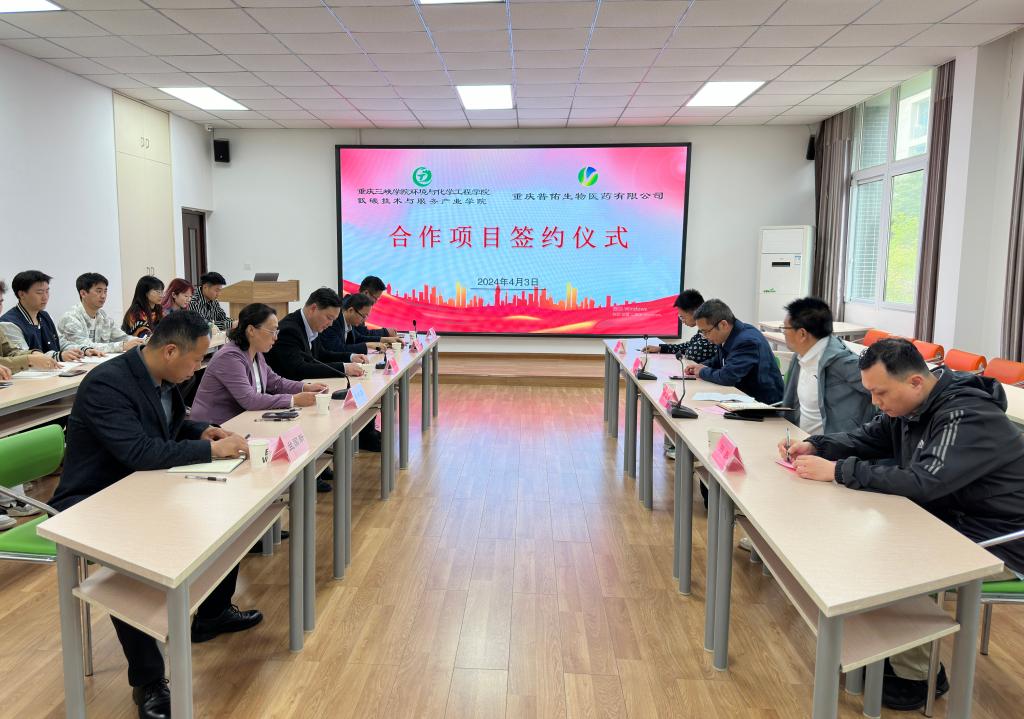4月3日,环化学院与重庆普佑生物医药有限公司举行签约仪式。重庆普佑生物医药有限公司总经理江涛、总经办主任谭名中等人,学校教务处副处长王广锋,环化学院党总支书记刘健、副院长黄美英等出席签约仪式。