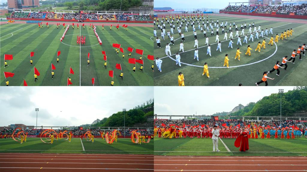 在大家的欢呼声与热烈的掌声中,大型文体表演正式开始。《开门红》的激情开场,向我们展示出了中华民族自强不息,顽强拼搏的精神;由师生们共同表演的《摆手舞》节奏欢快,动感极强;《武术空竹舞破苍穹》里的刚柔并济,《太极拳比赛》里的内外兼修,既是对文化的传承,也是对健康理念的传递;而兼具力量与美感的《啦啦操》则展现着青春无限的活力。在《龙腾狮跃耀三峡》中,动作刚劲的舞狮代表着力量与健康,灵活多变的舞龙代表着不屈与坚韧,而这也正是我们运动会想要传递的精神火炬。在最后的大合唱《我和我的祖国》里,三峡学子们用歌声表达着对祖国的热爱。