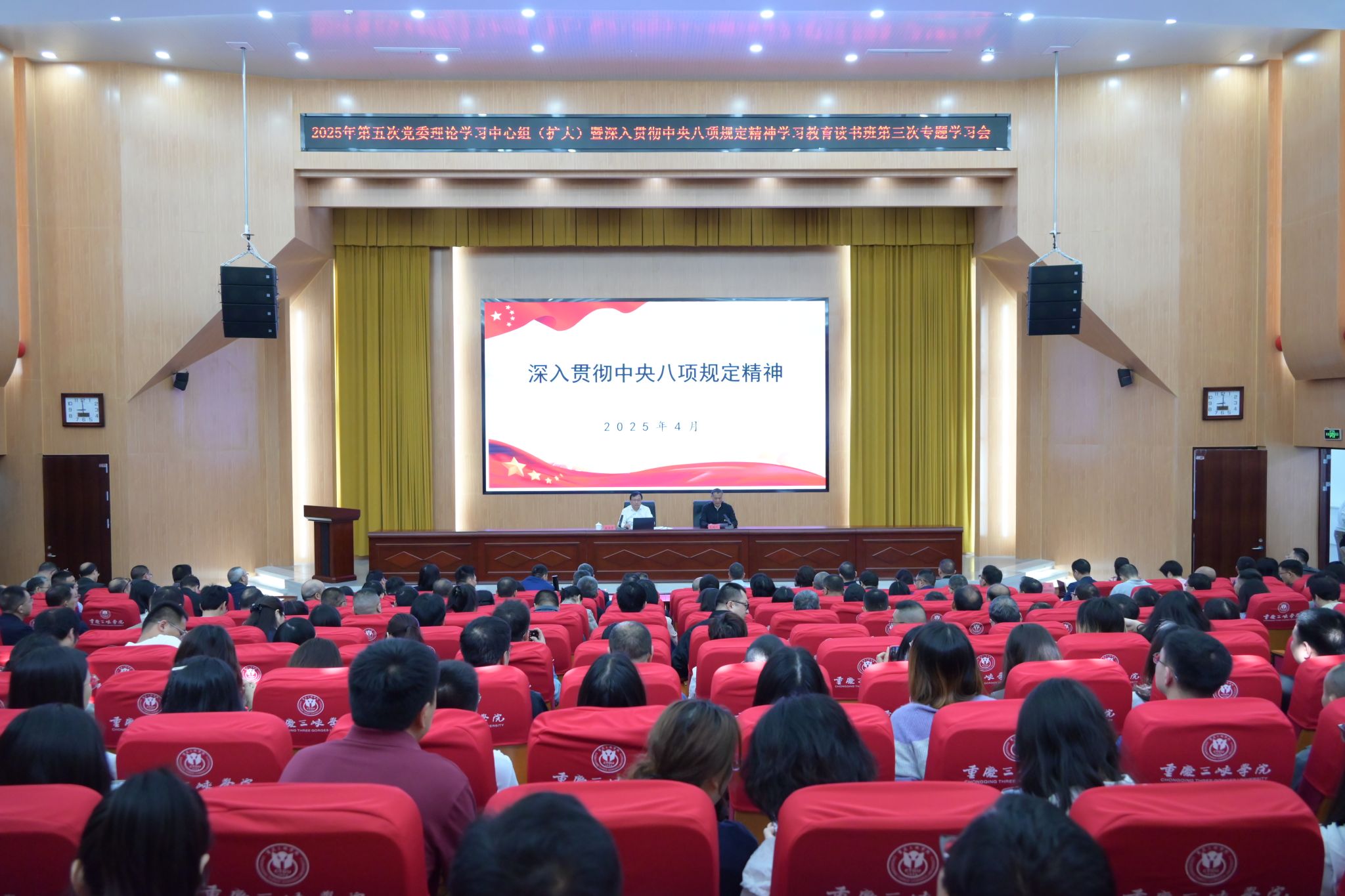 傅兵军从中央八项规定精神的起源、“四风”类别及隐形变异问题、贯彻落实的启示三部分内容展开讲授。傅兵军讲到,中国共产党自成立以来始终高度重视作风建设,不论是从“三大纪律、八项注意”到中央八项规定及其实施细则,还是从延安整风到全面从严治党,都体现了我们党以自我革命精神推进作风建设的决心和行动。全校上下要结合此次学习教育,深入学习领会习近平总书记关于加强党的作风建设的重要论述和中央八项规定及其实施细则精神,更加清醒地认识作风建设的长期性、复杂性,更加清晰地把握新时代新征程深化作风建设的路径方法,始终坚持以党的政治建设为统领,以密切党同人民群众血肉联系为根本,坚持领导干部带头以上率下,用好集中性学习教育载体,做到立破并举扶正祛邪,以钉钉子精神保持战略定力,推动全党动手一起抓,持续推动深入贯彻中央八项规定精神学习教育走深走实,以作风建设新成效为进一步全面深化改革、奋力谱写中国式现代化重庆篇章提供有力保障。