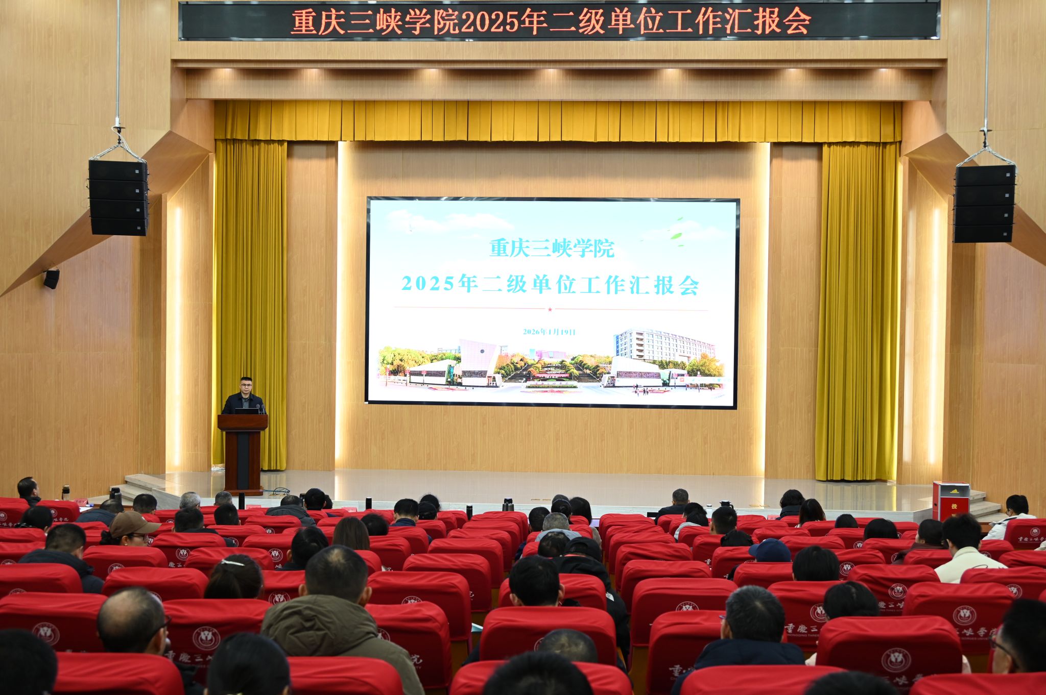 1月19日,学校在博学楼群多功能厅召开2025年二级单位工作汇报会。全体校领导,副处级及以上干部,师生代表等参加会议。校长李敬主持会议并作总结讲话。