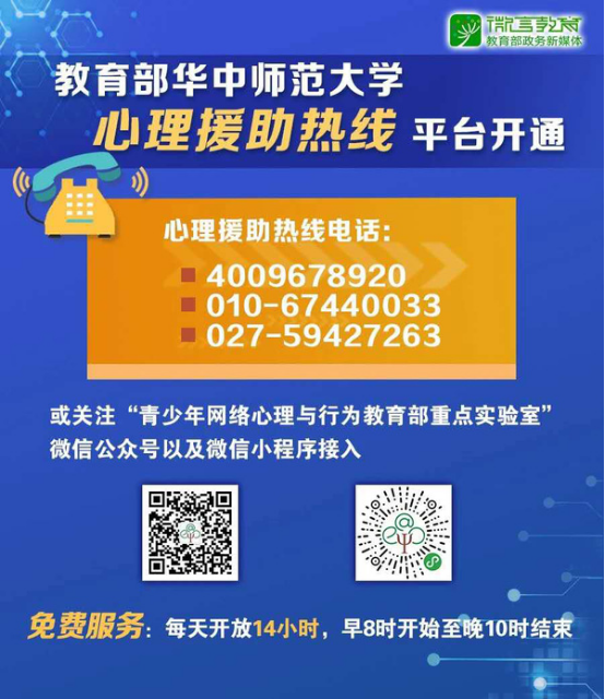 教育部华中师范大学心理援助热线:4009678920、010-67440033