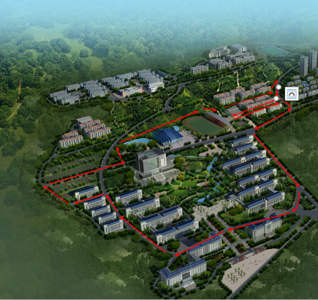 第一运动场(起点)——海棠苑1舍外公路——右转(下行)——银杏1路——右转(下行)——求索大道——左转(下行)——香樟1路——右转——明辨楼1栋——左转——笃行楼群(体育学院)——网球场——篮球场——右转——求索大道——左转(上行)——红叶路——海棠苑4舍——南浦苑2号门外——右转(下行)——海棠苑1舍外公路——第一运动场(终点)。