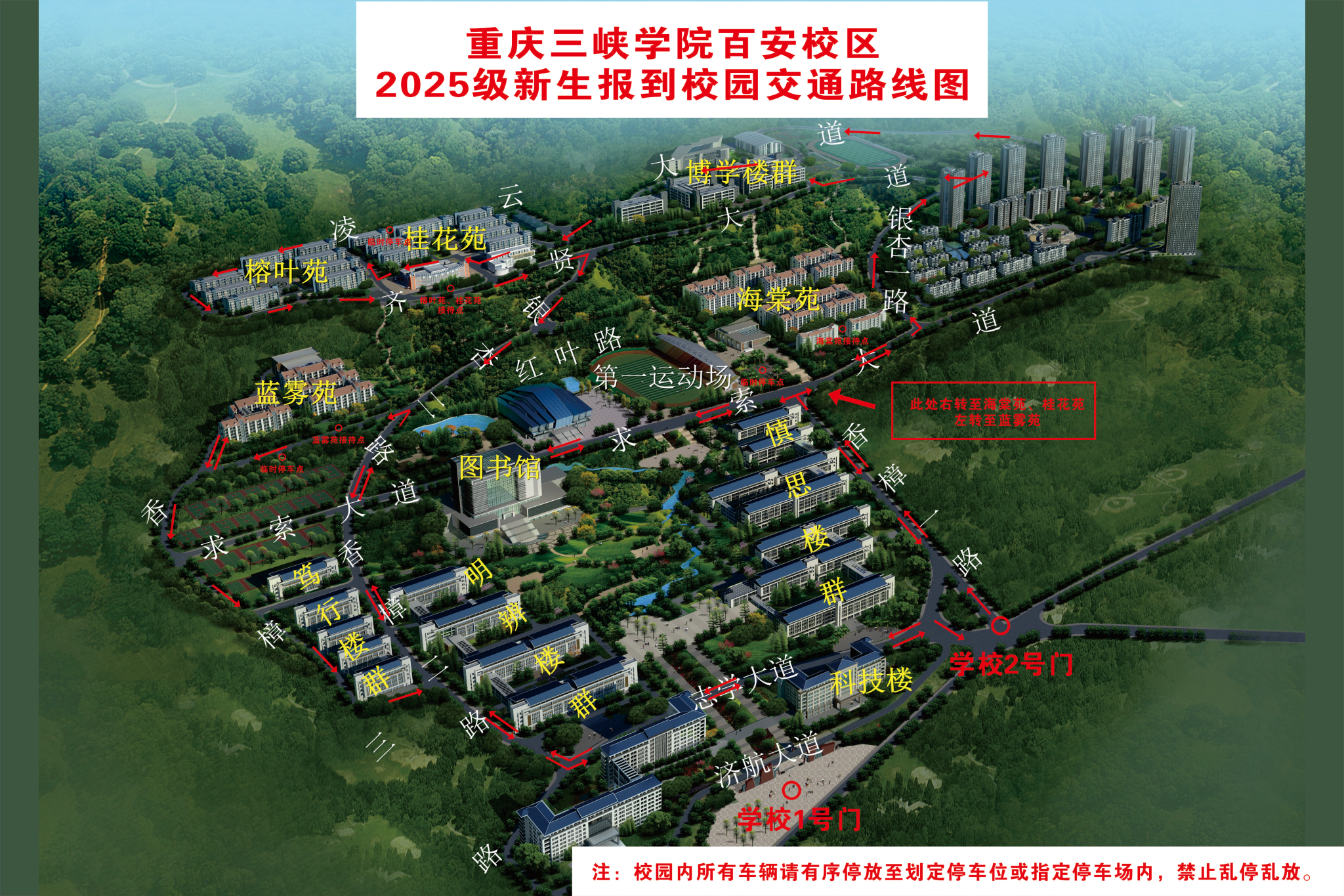 1.在博学楼1-3栋上班的老师请从银杏一路、齐贤大道行驶至停车场,离开时请从齐贤大道沿银杏二路向下绕行,在博学楼4-5栋、榕叶苑、桂花苑、山顶食堂等上班的老师请按照图标及现场安保人员指挥行驶。