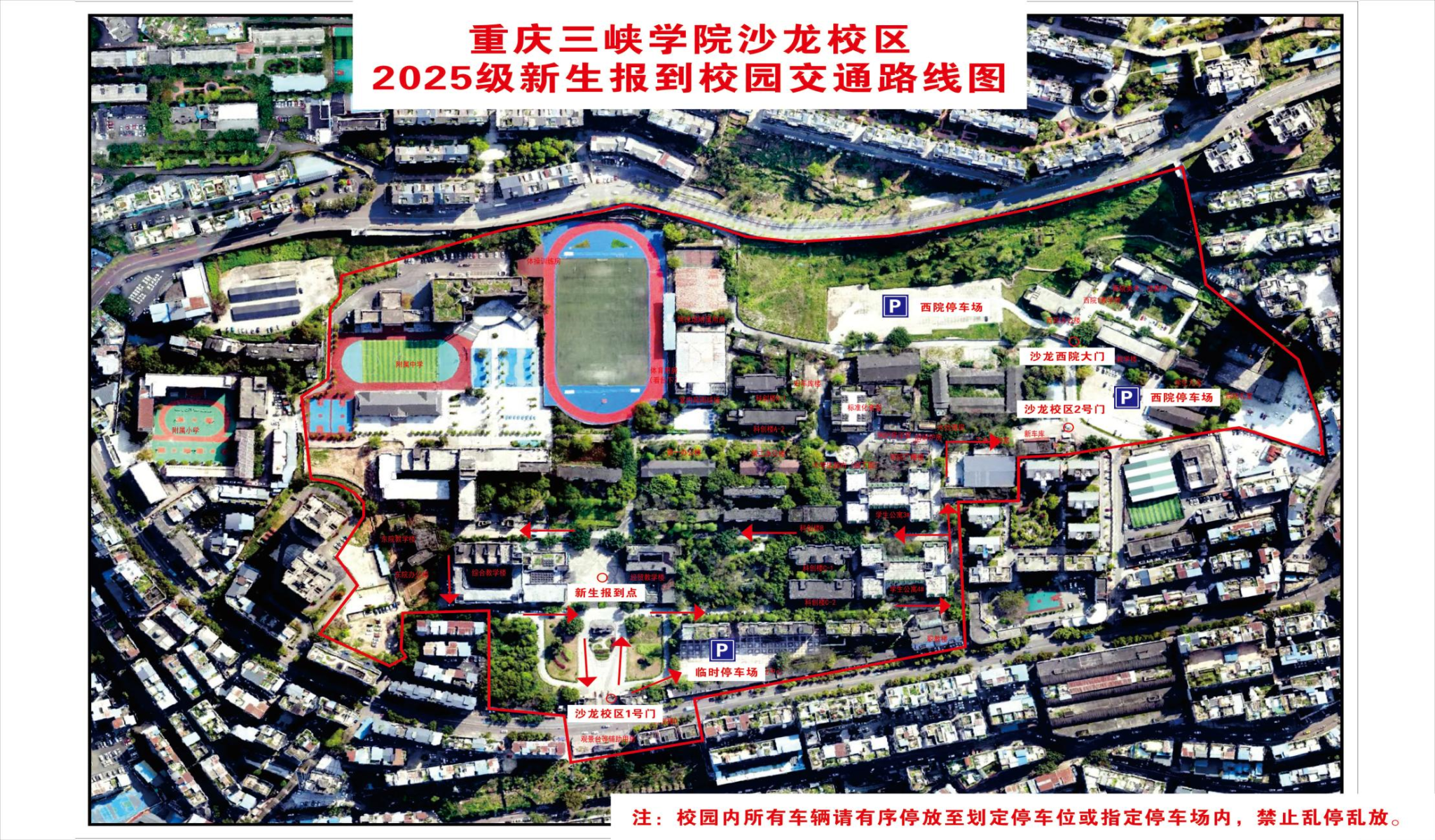迎新期间,校园内车辆行驶路线实行“单向循环”,管制路段:校大门→回归路→宿舍区→附中→大门出口,反向为禁止通行。