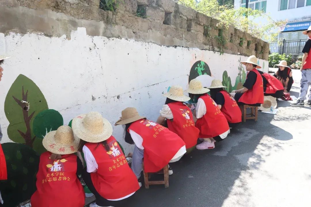 由美术学院组成的“乡村振兴促进团—暑期文化艺术服务团”将自己的爱与温暖融入到色彩中,在灰白色的墙壁上勾勒出绿水青山,优美淡雅,饰以卡通形象,活泼生动。队员们通过绘画的方式引导村民们保护环境。美化后的墙面,也成为了队员们与村民之间无需言语的默契。