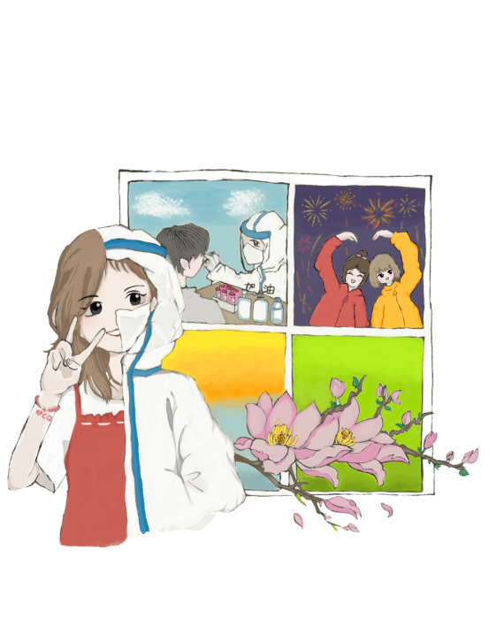 第一张图片体现出抗疫期间人与人之间的关怀与温暖,寒冬终将过去,春天即将到来;第二张图片则表现游人在跨年烟花秀上欣喜合影,璀璨烟火扫除疫情阴霾;第三张图片是日落照耀下的嘉陵江,也象征着前方新征程的璀璨星光;最后一张图是绿色山林,春意盎然,生机勃勃,表现对未来光明到来的期盼。