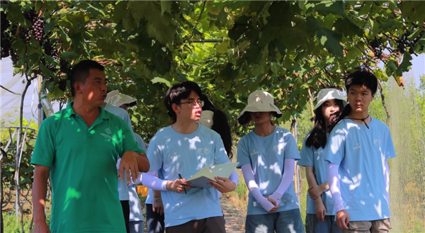 7月18日,实践团队在指引下首先来到了仁贤水果大观园的精品果园之一——朝思暮想葡萄园。“满架高撑紫络索,一枝斜亸金琅珰”,在葡萄廊下,团队成员聆听并记录果园朱老板对园中水果品种、种植方法、销售方式等的讲解,葡萄园为综合性果园,除了主要水果葡萄外,另有李子、西梅、油桃种植,通过朱老板的细致讲解,实践团队获取了真实的资料,为后期整体分析奠定了基础。