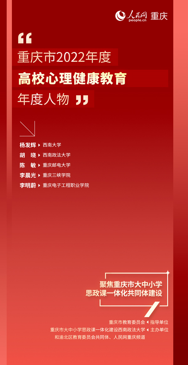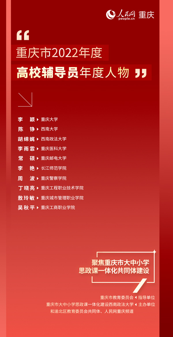 名单涵盖五大类别,最终评选出2022年重庆市高校辅导员年度人物10名、2022年重庆市高校思想政治理论课教师年度人物10名、2022年重庆市高校心理健康教育年度人物5名、2022年重庆市高校优秀辅导员20名、2022年重庆市高校优秀思想政治教育工作者20名。