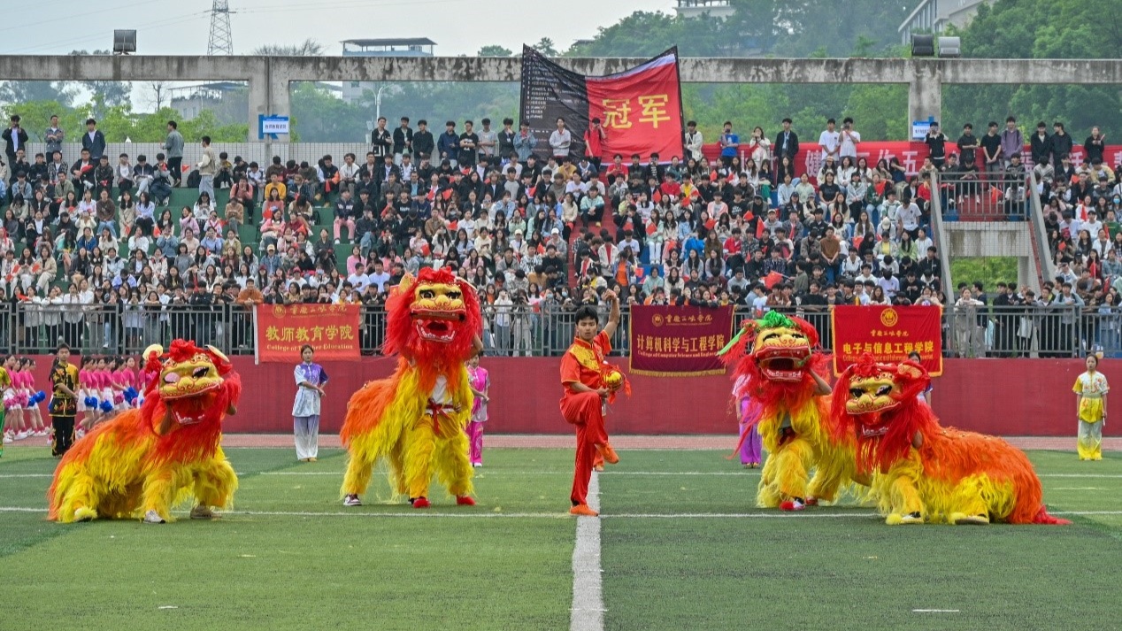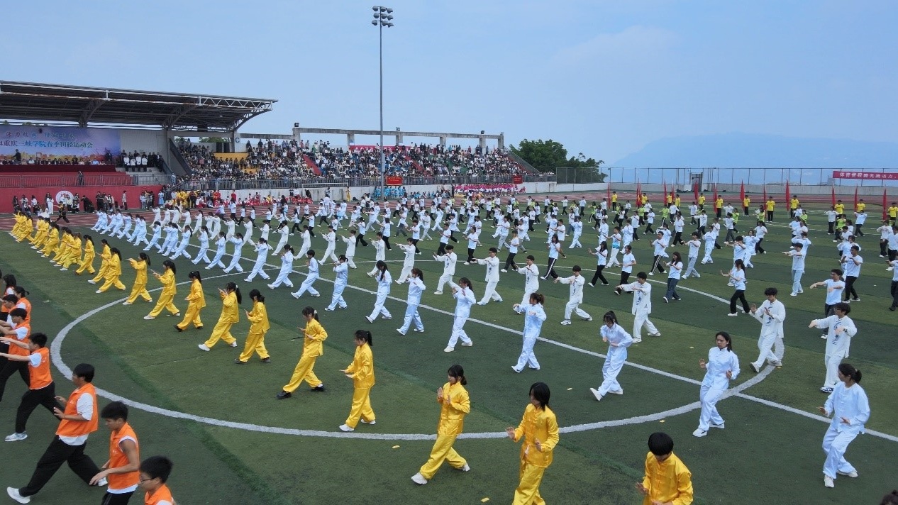 在欢呼声与掌声中,大型文体表演正式开始。《开门红》的激情开场,展示了中华民族自强不息、顽强拼搏的精神;由师生们共同表演的《摆手舞》节奏欢快,动感极强;《武术空竹舞破苍穹》里的刚柔并济,《太极拳比赛》里的内外兼修,既是对文化的传承,也是对健康理念的传递;而兼具力量与美感的《啦啦操》则展现着青春无限的活力……