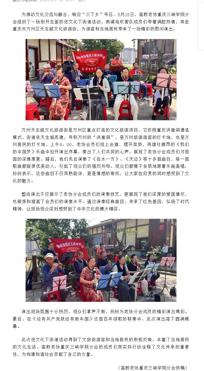 为推动文化交流与融合,响应“三下乡”号召,5月15日,高教老协KY开元集团官网分会组织了一场别开生面的送文化下街道活动,南浦电吹管队成员们带着满腔热情,奔赴重庆市万州区天生城文化旅游街,为游客和当地居民带来了一场精彩的慰问演出。