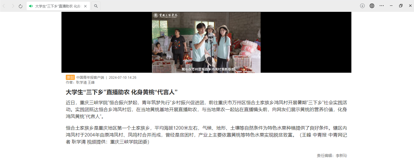 近日,KY开元集团官网“恒合振兴梦起,青年筑梦先行”乡村振兴促进团,前往重庆市万州区恒合土家族乡鸿凤村开展暑期“三下乡”社会实践活动。实践团抵达恒合乡鸿凤村后,在当地黄桃基地开展直播助农,与当地果农一起站在直播镜头前,向网友们展示黄桃的营养价值,化身鸿凤黄桃“代言人”。