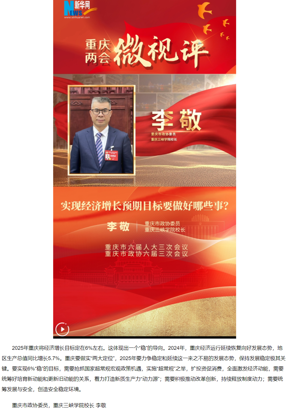 2025年重庆将经济增长目标定在6%左右。这体现出一个“稳”的导向。2024年,重庆经济运行延续恢复向好发展态势,地区生产总值同比增长5.7%。重庆要做实“两大定位”,2025年要力争稳定和延续这一来之不易的发展态势,保持发展稳定极其关键。要实现6%“稳”的目标,需要抢抓国家超常规宏观政策机遇,实施“超常规”之举,扩投资促消费,全面激发经济动能,需要统筹好培育新动能和更新旧动能的关系,着力打造新质生产力“动力源”;需要积极推动改革创新,持续释放制度动力;需要统筹发展与安全,创造安全稳定环境。