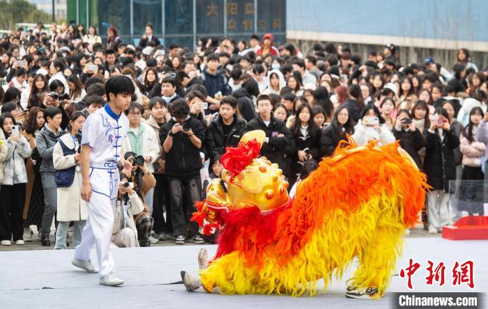 图为大学生观看舞狮。冉孟军 摄