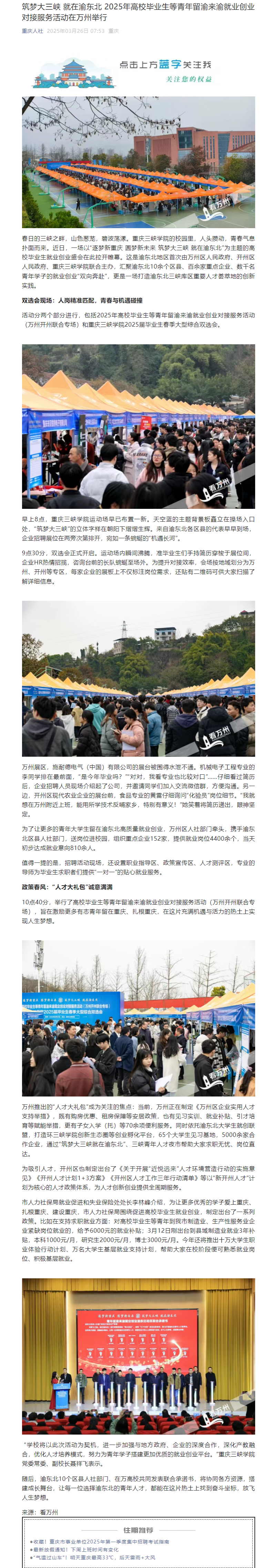 下一条:2025年3月25日《衡水新闻网》:「逐梦新重庆·圆梦新未来筑梦大三峡·就在渝东北」2025年高校毕业生等青年留渝来渝就业创业对接服务活动圆满举行