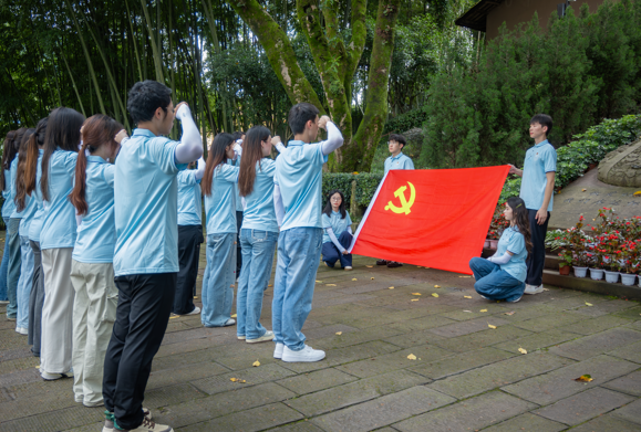 手捧白菊,步履庄重,团队成员走进肃穆的刘伯承陵园,将象征追思与承志的鲜花轻放于元帅塑像前,以鲜花致敬先烈,铭记历史。全体人员在鲜红的党旗与团旗下重温誓词,表达着对党的忠诚和坚定信念,传递了青年一代对红色血脉的坚定传承与勇担时代使命的赤子情怀。