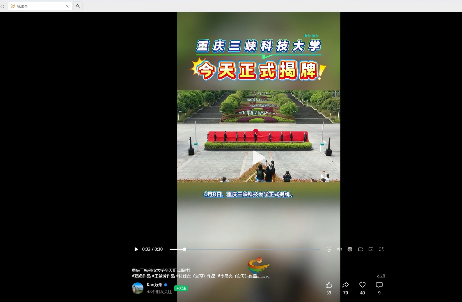 2026年4月8日《看万州 视频号》:重庆三峡科技大学今天正式揭牌!