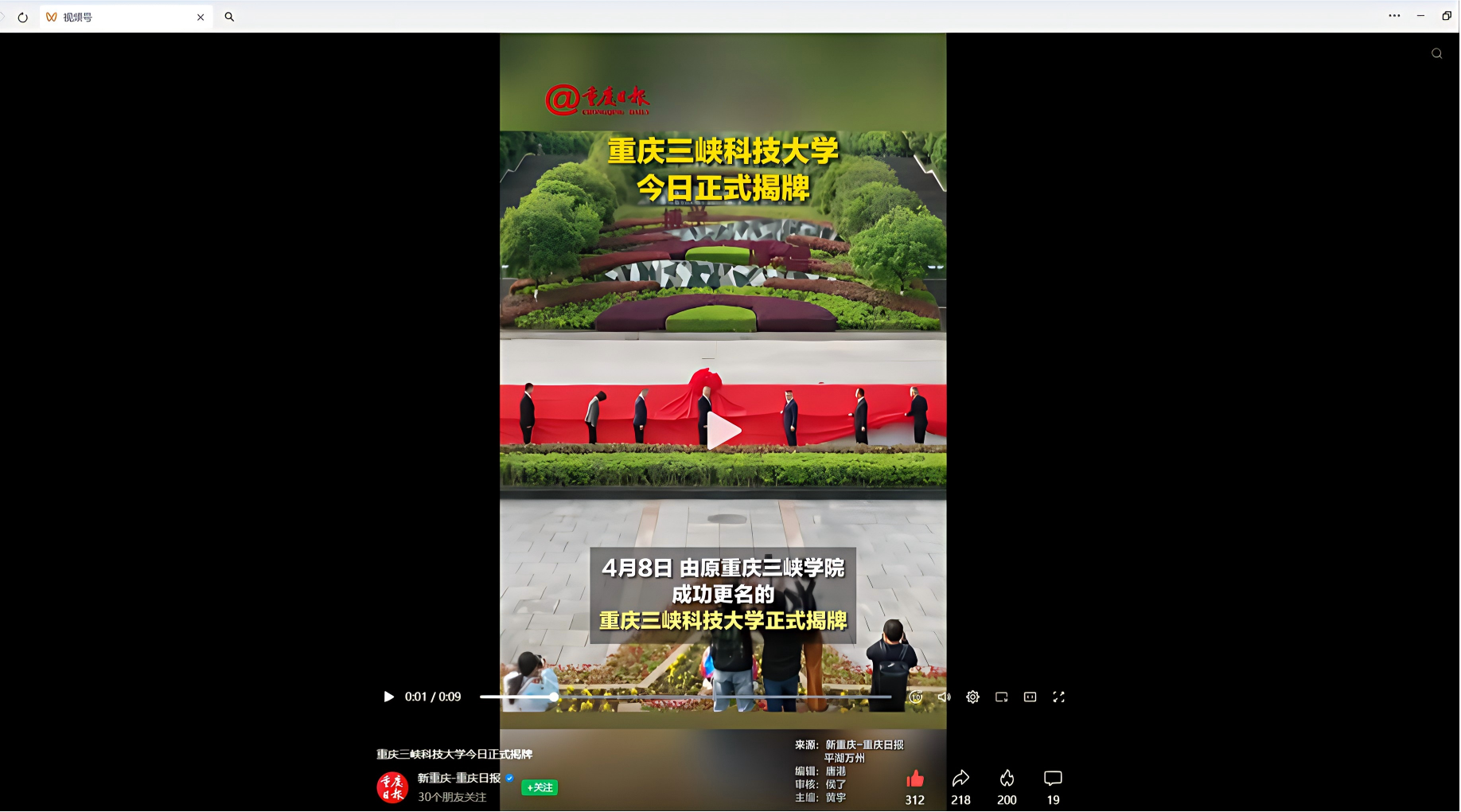 2026年4月8日《重庆日报 视频号》:重庆三峡科技大学今日正式揭牌