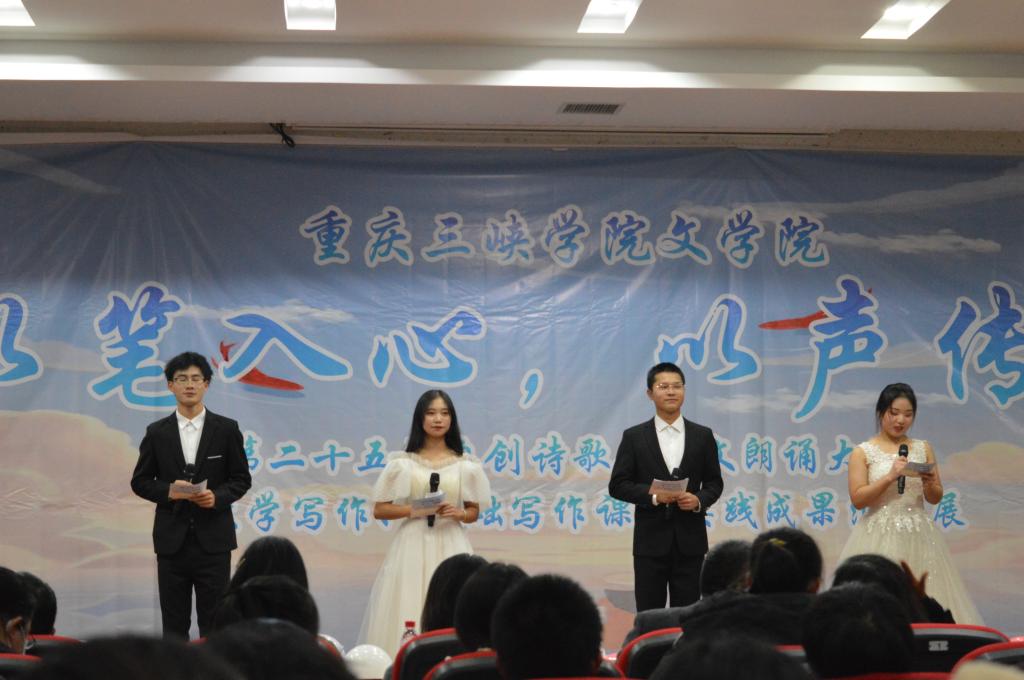 12月16日,文学院第25届自创诗歌、散文朗诵大赛暨大学写作、基础写作课程实践成果汇报展在明辨楼2-104举办。文学院领导班子及部分教师代表共同出席本次大赛并担任评委。《大学写作》授课教师严小红和《基础写作》授课教师邢文、辅导员刘林精全程指导并出席此次大赛。