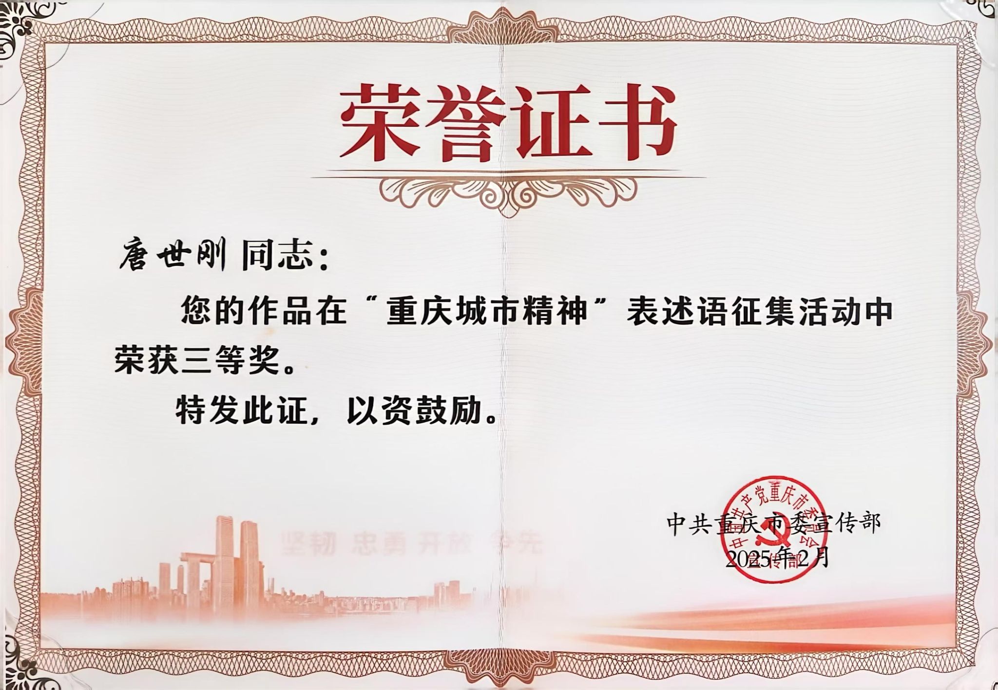 据悉,“重庆城市精神”表述语征集活动自2024年3月启动以来,迅速在社会各界掀起讨论热潮。活动通过媒体、信函、行业、学校、群众等多种渠道征集、遴选出表述语7695条。经精心筛选、专家初评、市民投票等环节,推选出具有广泛认可度和显著辨识度的10条表述语。2024年12月26日,重庆市委宣传部召开重庆城市精神新闻发布会,正式宣布“坚韧、忠勇、开放、争先”成为重庆城市精神表述语。这是直辖以来,重庆第一次提炼、发布城市精神。