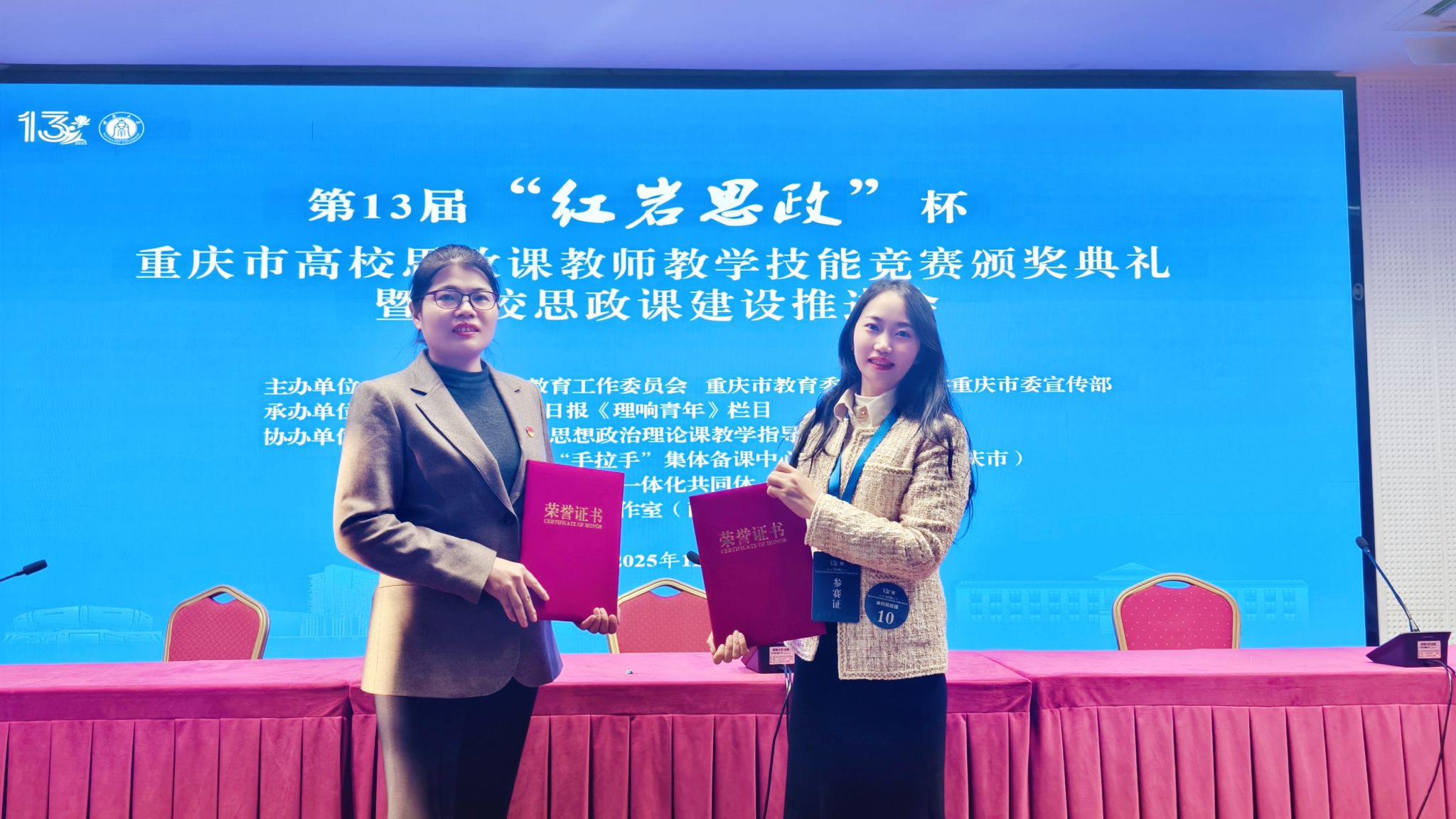 11月20日至21日,第13届“红岩思政”杯重庆市高校思政课教师教学技能竞赛决赛圆满落幕。经过校级选拔、市级课程组复赛、决赛等环节激烈比拼,开元官网马克思主义学院推选的五位教师全部获奖。其中,黄冬梅、李爱梅两位老师入围决赛,荣获二等奖;王迪、阎茂瑶、郭庆玲三位老师凭借在课程组复赛中的良好表现,荣获三等奖。