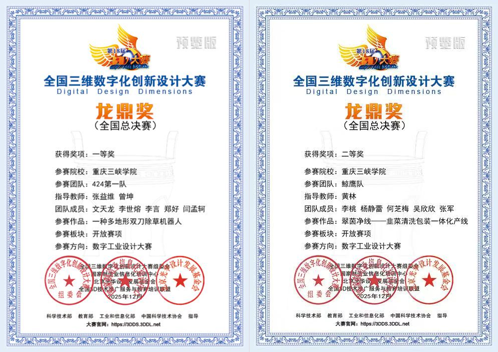 近日,第18届全国三维数字化创新设计大赛年度总决赛落幕。机械工程学院学生团队凭借“一种多地形双刀除草机器人”(学生:文天龙、李世熔等,指导老师:张益维、曾坤),“翠茵净线——韭菜清洗包装一体化产线”(学生:李桃、杨静蕾等,指导老师:黄林)作品,从全国千余项总决赛入围作品中脱颖而出,分别荣获全国一等奖、二等奖。