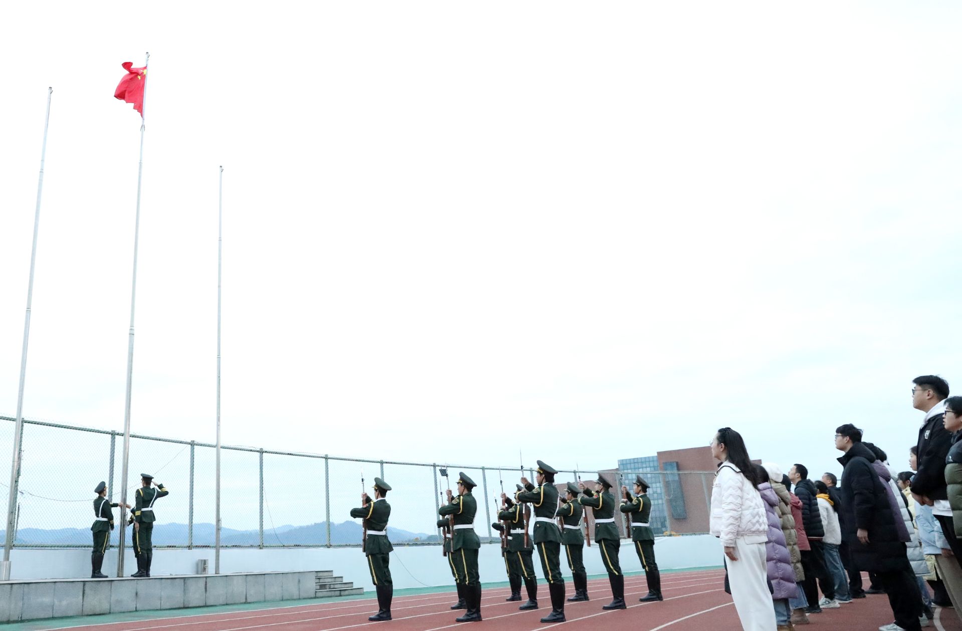 在庄严肃穆的气氛中,大学生国旗护卫队护送国旗走向升旗台。伴随着《义勇军进行曲》,五星红旗冉冉升起,全体师生面向国旗行注目礼。